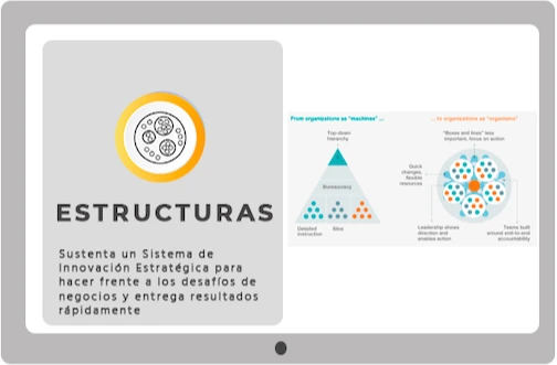 La forma en la que la gente se organice para gestionar la innovación (equipos de liderazgo, iniciativas, gestión), así como las estructuras organizacionales que definas, pueden ser grandes habilitadores o bien pueden terminar matando tus esfuerzos de innovación.
