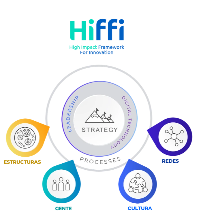 Ocho elementos que permitirán que tu empresa gestione la innovación de forma holística: Estrategia; Liderazgo; Tecnología Digital; Procesos; Redes; Cultura; Gente; y Estructuras